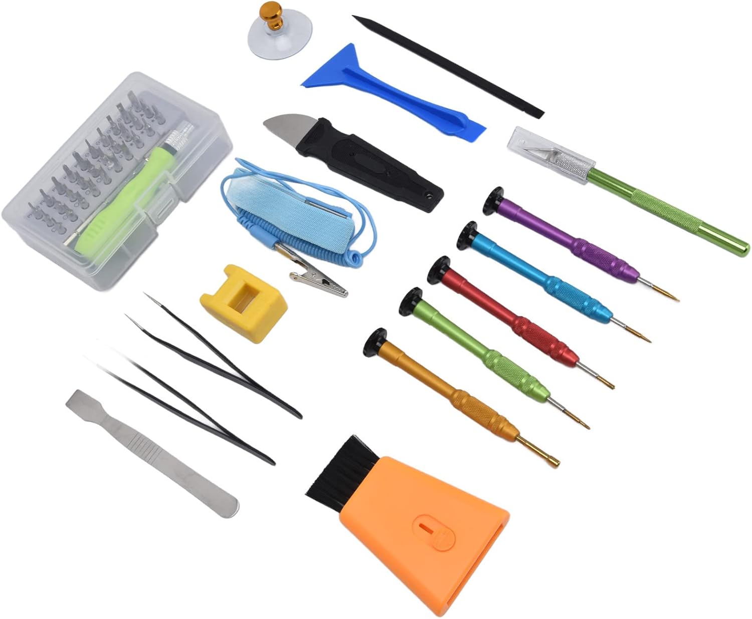 Item Type: Repair Tool KitMaterial: PA66Purpose: For professional maintenance on mobile phones, PCs, watches, glasses, laptops, phones, game consoles, cameras, host computers, etc. Package List:5 x Accuracy Screwdriver1 x Crow Bar1 x Cutting Knife2 x Tweezers1 x Metal Scraper1 x Plastic Scraper1 x Warped Knife1 x Brush1 x Magnet1 x Suction Cup1 x Wrist Strap1 x Screw Kit (Including 30 x Screwdriver Bit, 1 x Extension Socket, 1 x Bit Holder, 1 x Storage Box)1 x Storage BagNote:There are small accessories in the product, please pay attention to children's accidental eating by mistake. Please note that the accessories color of this product will be sent randomly, and make sure you will not mind before ordering.